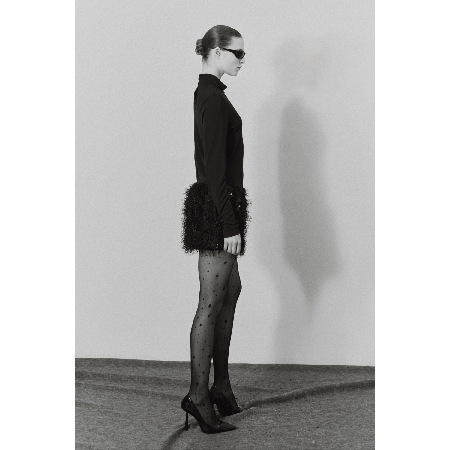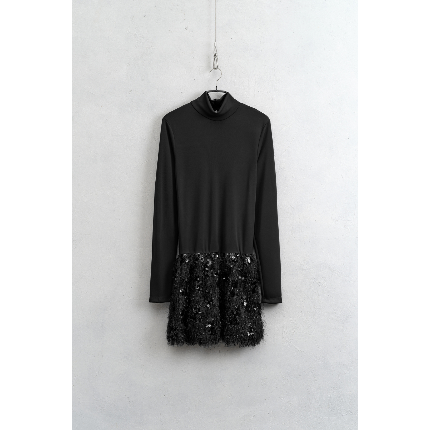 Ψηλός λαιμός και φούστα με παγιέτες.